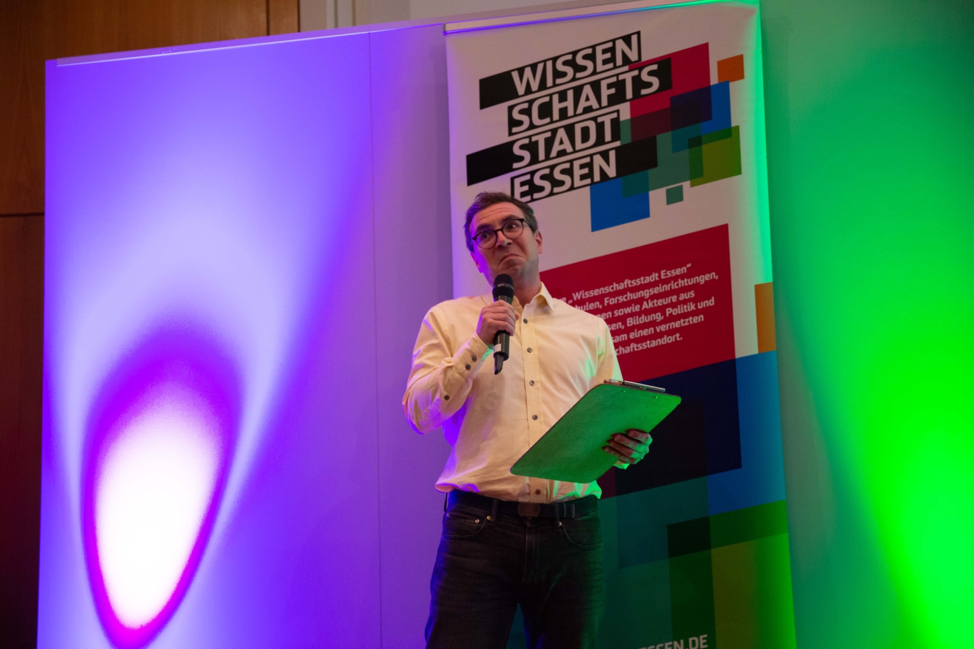 - Prof. Stefan Heinemann, Vorstandsvorsitzender der Initiative Wissenschaftsstadt Essen, begrüßt charmant die 250 gut gelaunten Gäste im Haus der Technik.